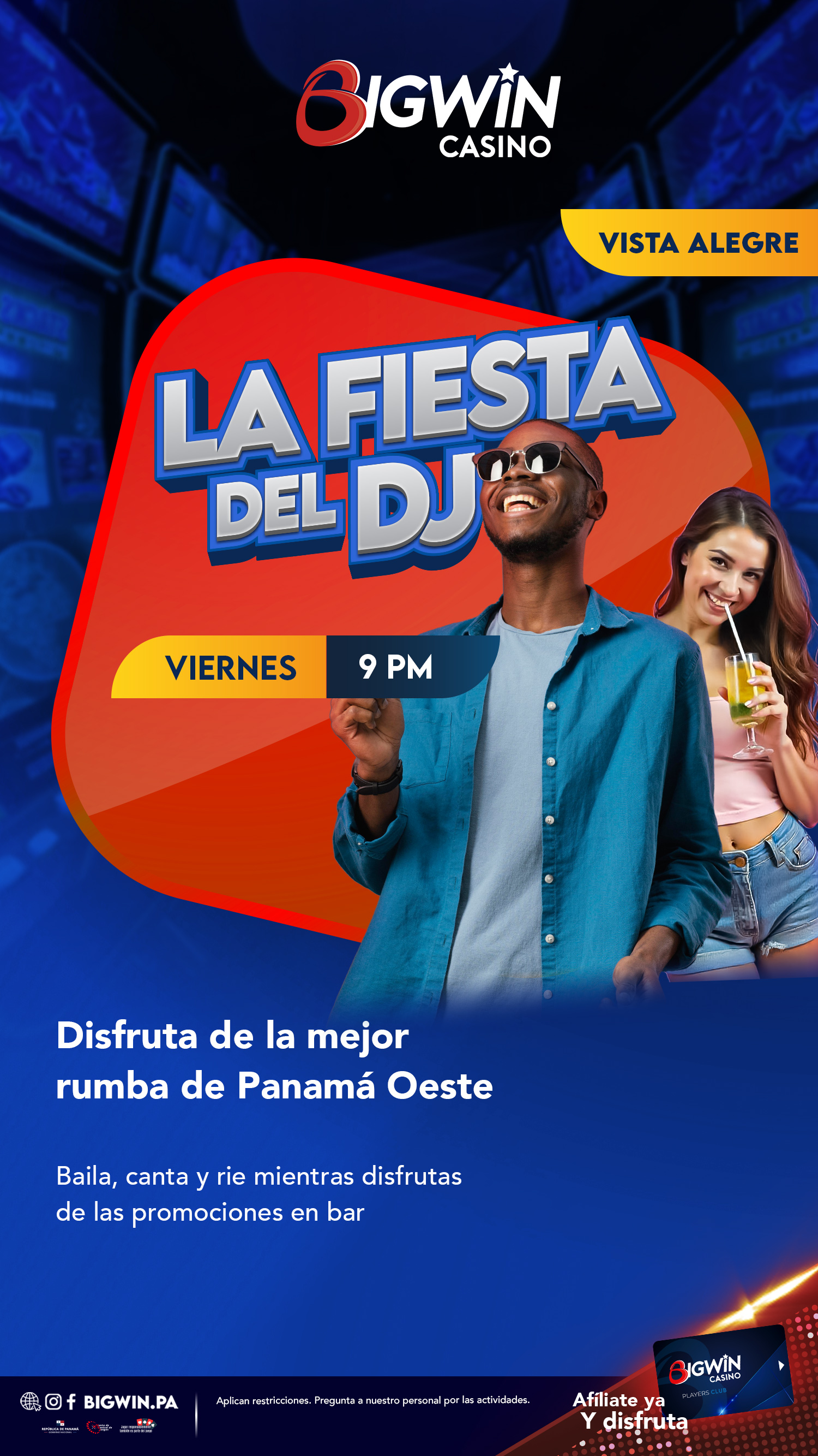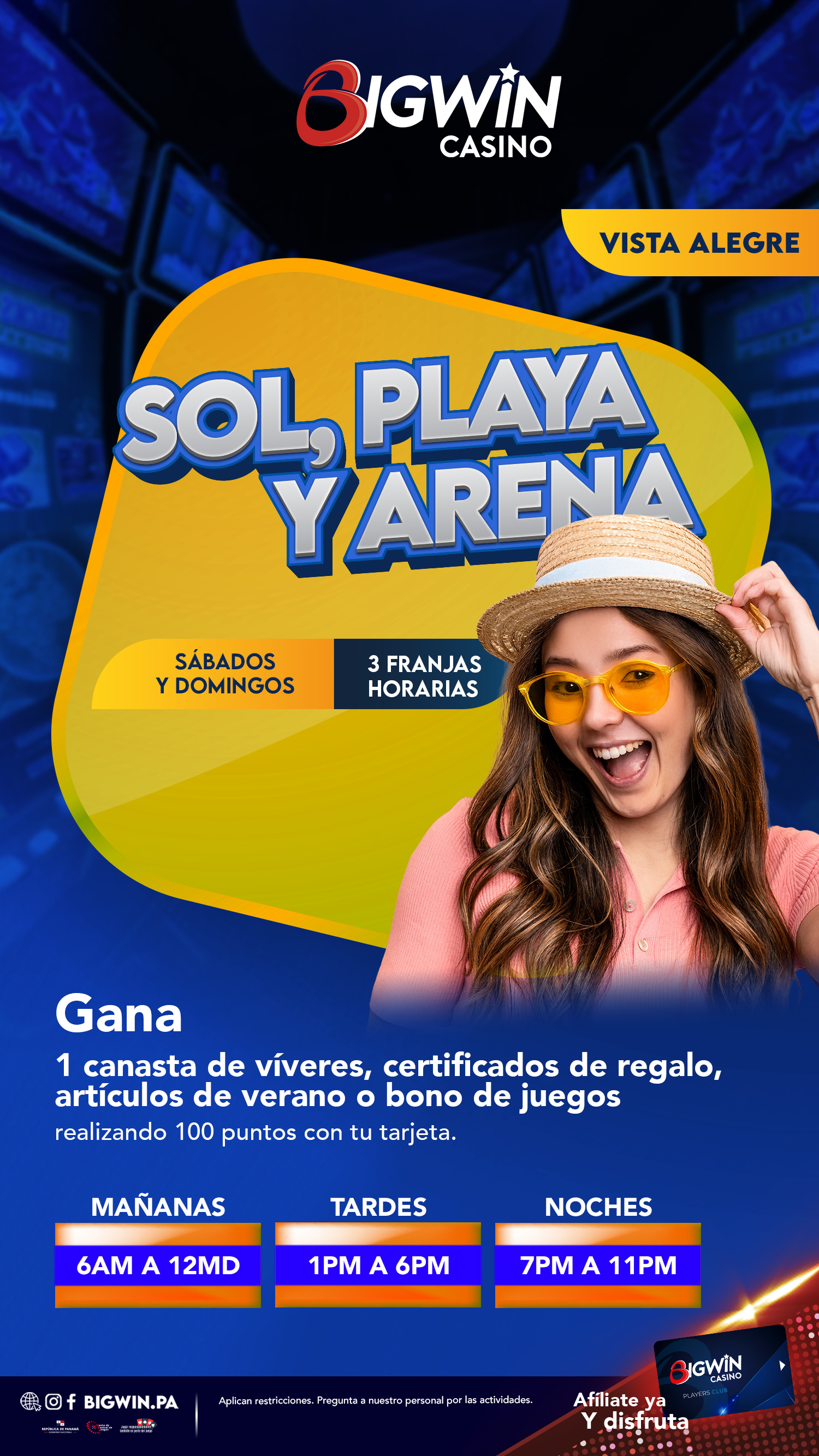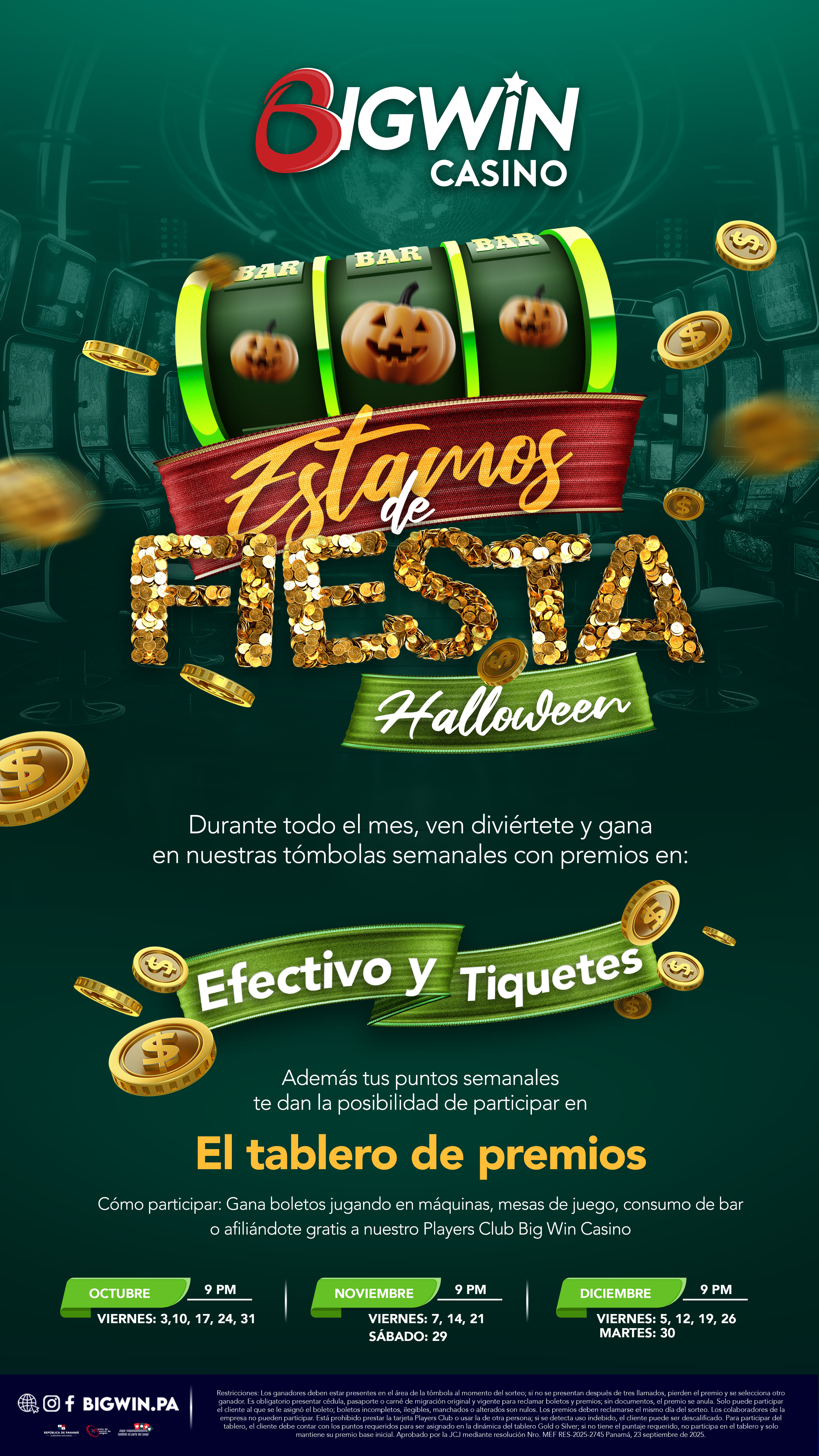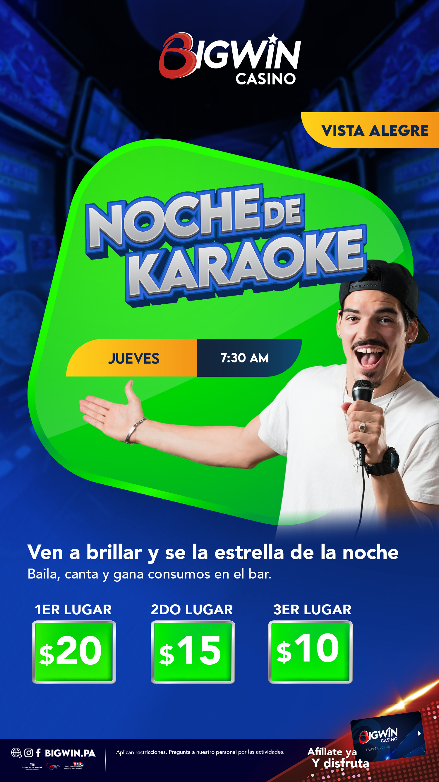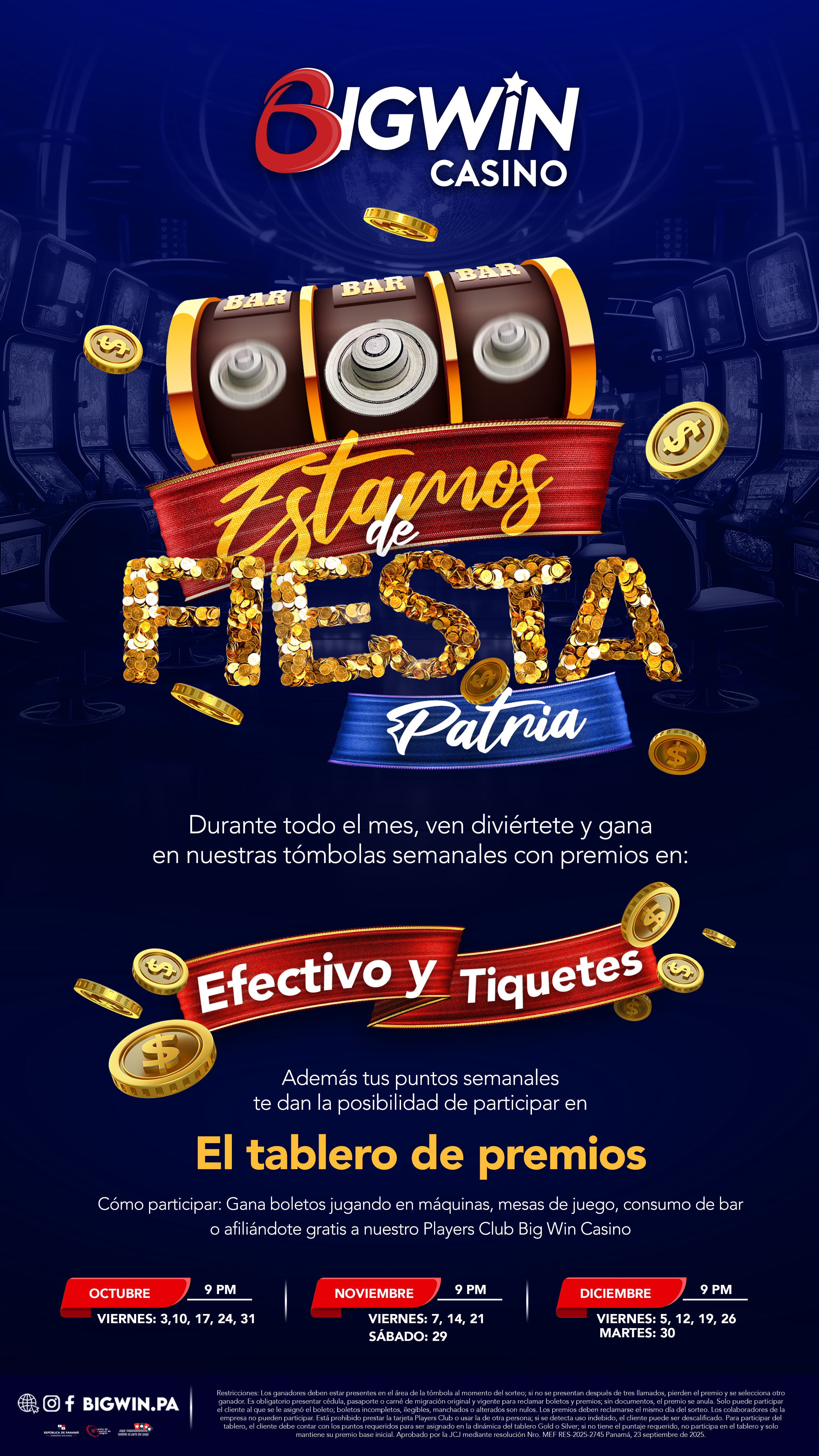 Inscríbete en nuestro Big Win Players Club y recibe un bono de $2 para empezar a jugar en maquinitas. Acumula puntos cada vez que la utilices, los cuales puedes cambiar por tickets promocionales, según la tabla de valores, para que puedas continuar con la diversión, además de participar en tómbolas por premios especiales y efectivo.
